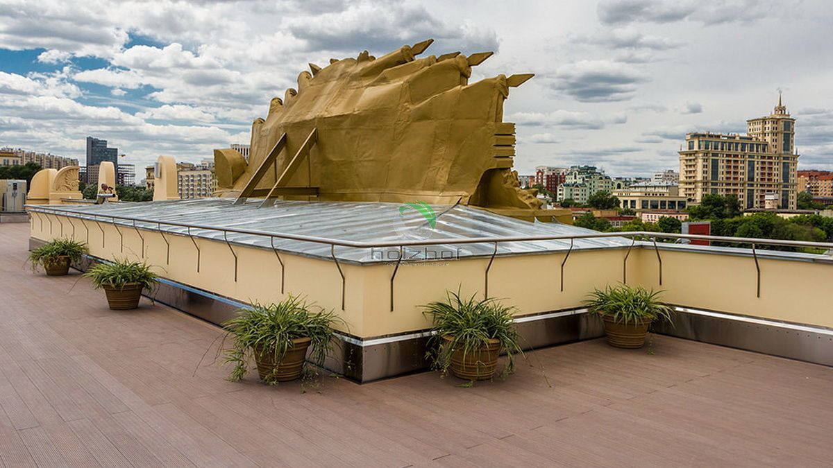 11 июня 2015 года было открыто после реставрации здание Главного входа в Парк Горького - легендарная арка на Крымском Валу, ставшая одним из символов Москвы, стала доступна для посетителей: в пилонах разместился Музей истории Парка Горького, а на крыше - смотровая площадка с видами на парк и город. Смотровая площадка на крыше Главного входа в Парк Горького находится на высоте 18 метров, её площадь составляет более 700 квадратных метров. При реставрации смотровой площадки была применена террасная доска Olympiya, которая отлично вписалась в общий экстерьер площадки, при этом обладая прекрасными свойствами по прочности и долговечности. Террасная доска не подвержена выгоранию, и крайне износоустойчива, что позволяет выдерживать перемены погодных условий и большой поток посетителей.