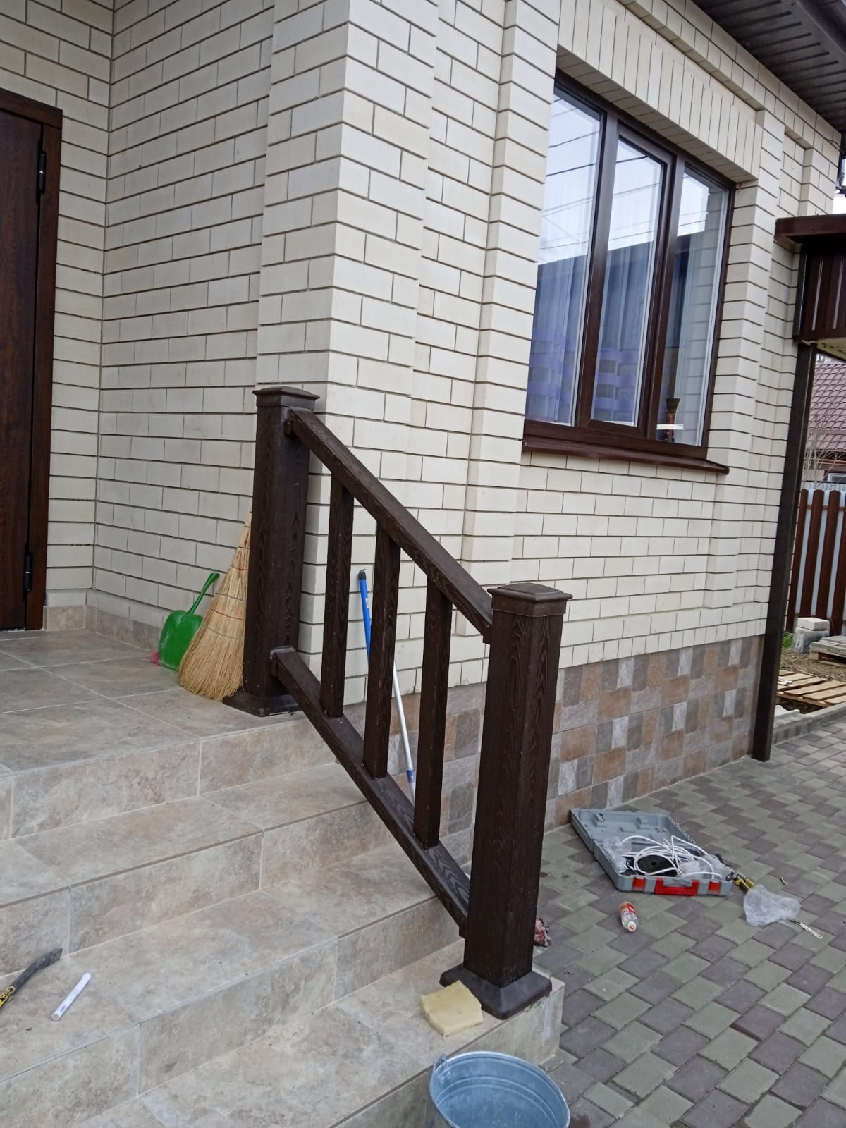 Произвели поставку и шеф-монтаж ограждения из ДПК NauticPrime (венге) на открытой площадке входной группы частного дома и перила для ступеней.